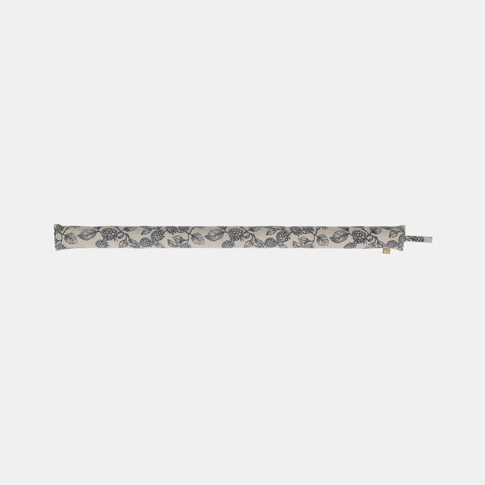 Berry & Bug recycled cotton draught stopper in blue botanical print on taupe chambray. A practical and stylish solution to reduce drafts while complementing your interior.