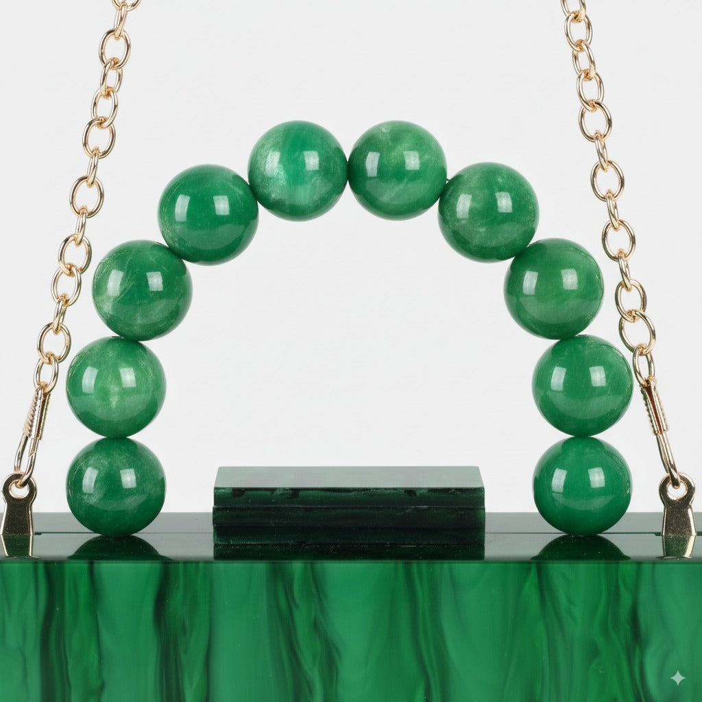 Featuring a sleek marbled acrylic body and a rounded beaded handle, this bag blends playful charm with modern sophistication. Perfect for evenings out or as a standout accessory to elevate any look.