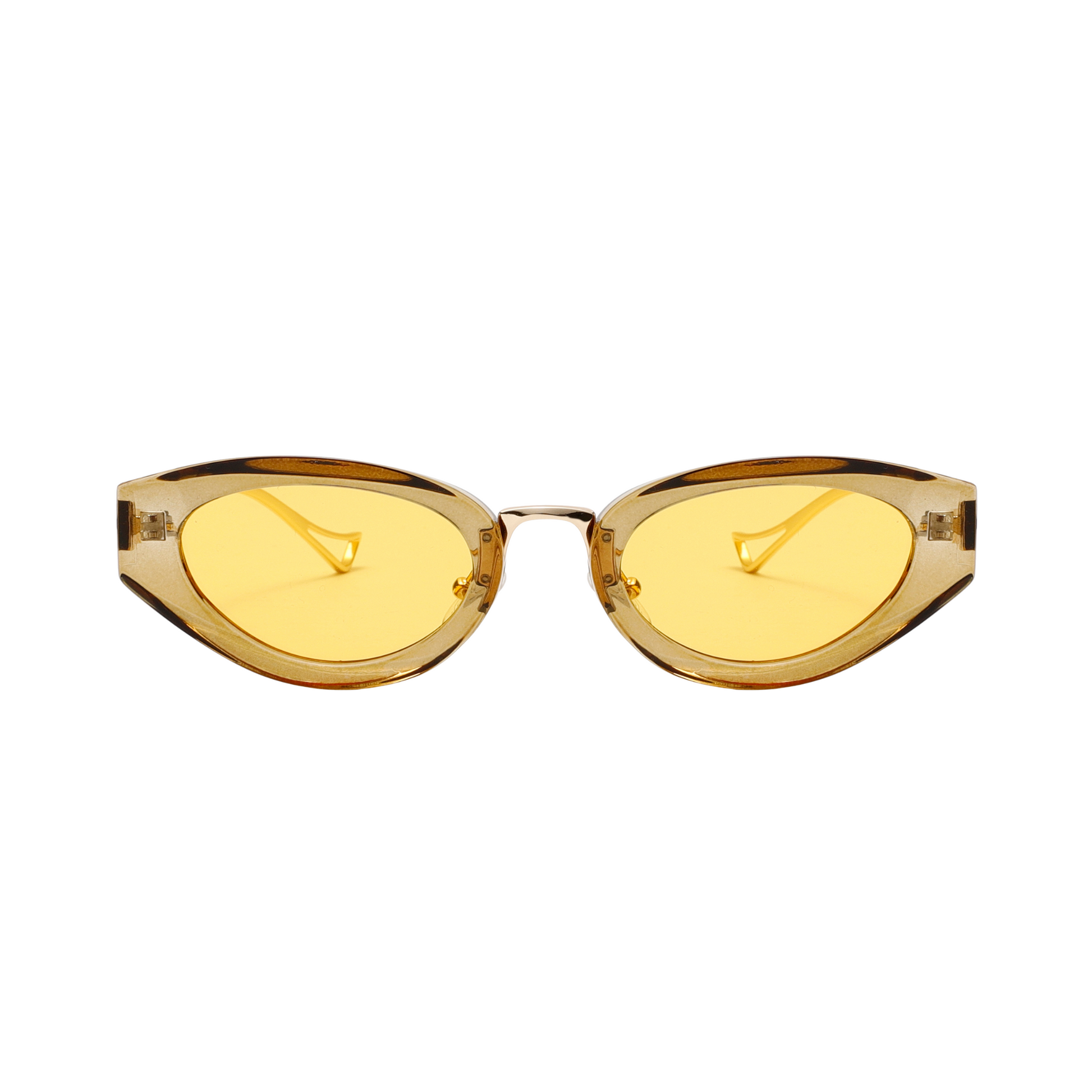 Striking and glamorous, Brianna Yellow Gold features sharp cat-eye frames paired with sleek gold arms, delivering a confident high-fashion look.
