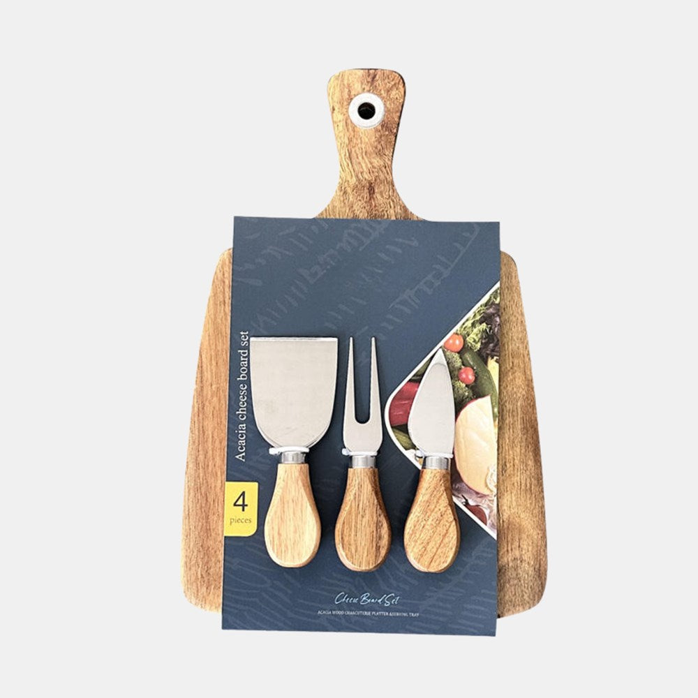 Medium rectangular acacia cheese board with three utensils, combining function and rustic elegance for entertaining.