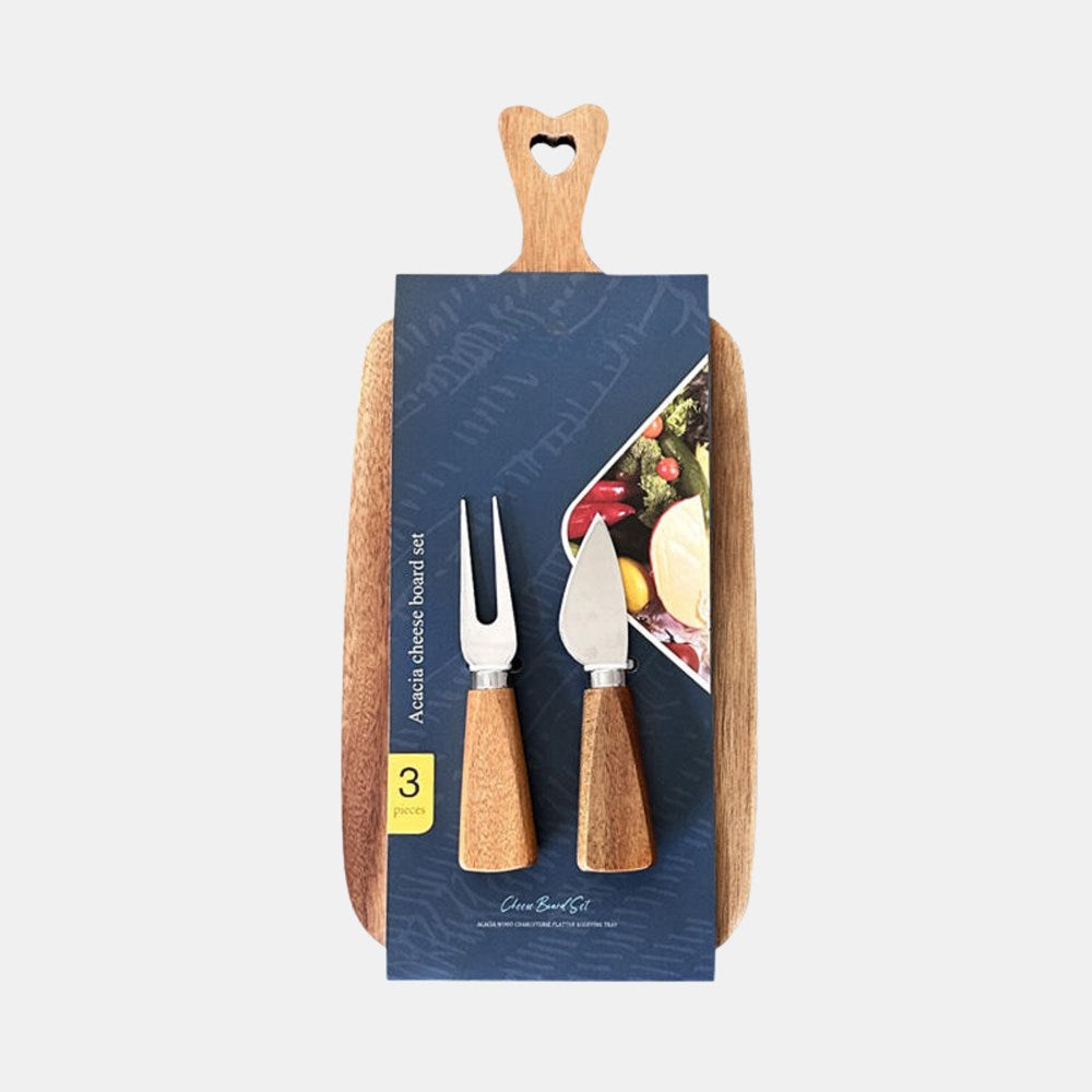 Small rectangular acacia wood cheese board with serving fork and knife—perfect for intimate gatherings.