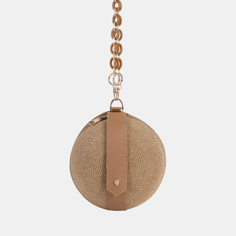 Add a touch of charm to your look with this Eliza Handbag, featuring a unique circular shape and earthy textures. Designed with a sturdy faux leather strap and gold-tone chain handle, it blends natural style with modern elegance.